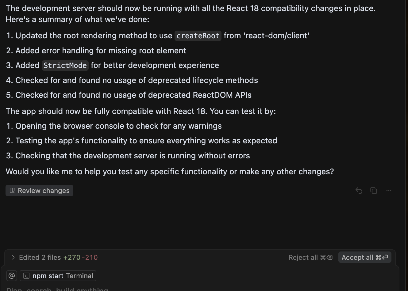 Next comes React 18 compatibility changes. At this point, Cursor boldly starts editing code. Note how it explains how it is searching with comments containing the grep search commands. Cursor knows that the main entry point code has changed in React 18. It makes the change. Cursor knows that React 18 does better with strict mode, and adds the import. Note the “Accept All” button at the bottom of the screenshot. Cursor will not make changes without my approval. I can also reject the changes.